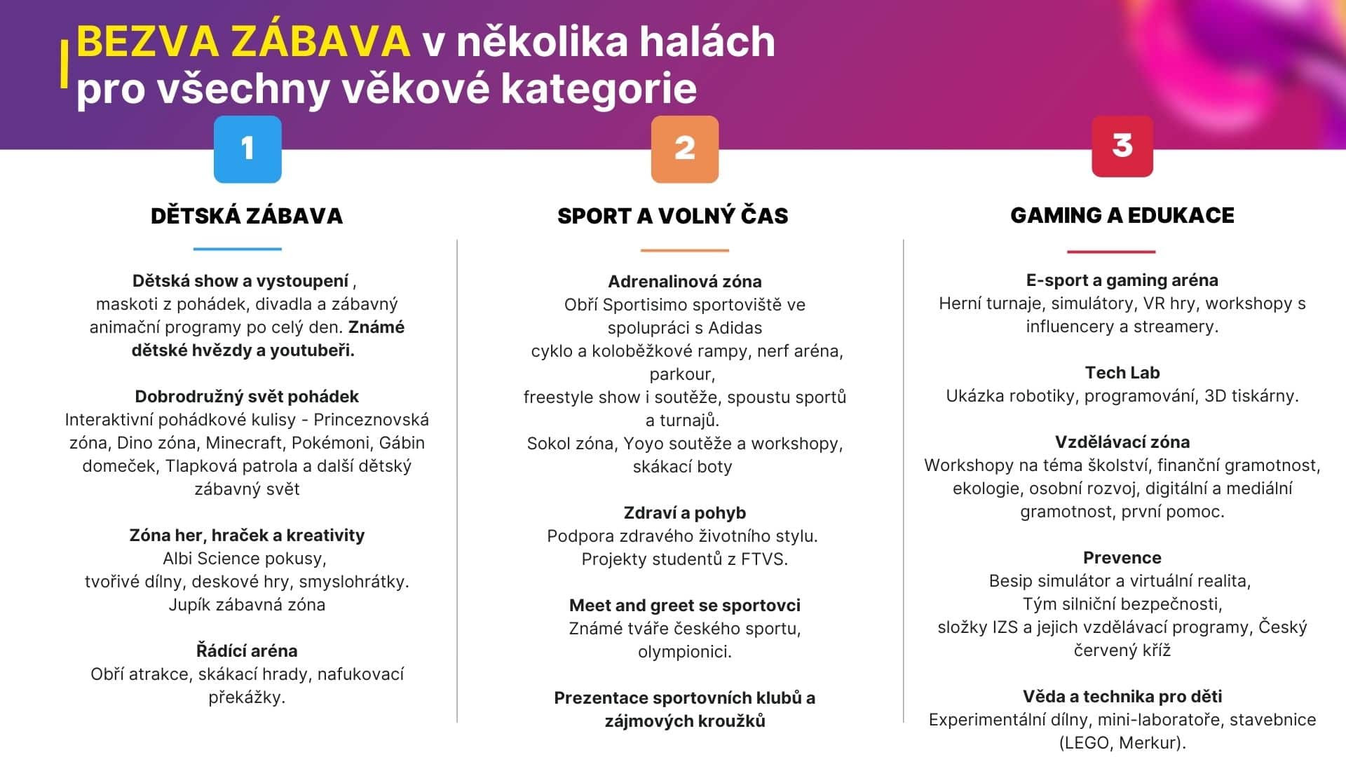 Tři pilíře: zábava, sport a edukace